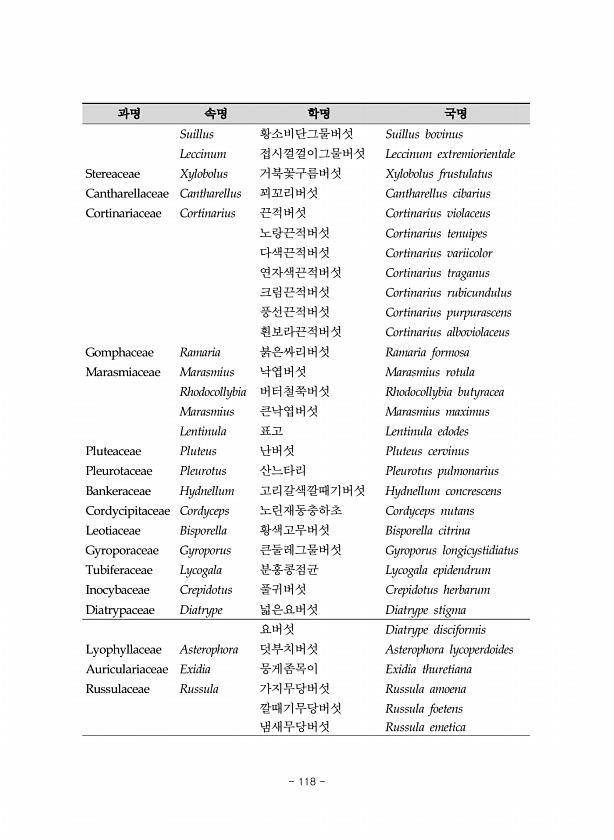 과명 속명 학명 국명 Suillus 황소비단그물버섯 Suillus bovinus Leccinum 접시껄껄이그물버섯 Leccinum extremiorientale Stereaceae Xylobolus 거북꽃구름버섯 Xylobolus frustulatus Cantharellaceae Cantharellus 꾀꼬리버섯 Cantharellus cibarius Cortinariaceae Cortinarius 끈적버섯 Cortinarius violaceus 노랑끈적버섯 Cortinarius tenuipes 다색끈적버섯 Cortinarius variicolor 연자색끈적버섯 Cortinarius traganus 크림끈적버섯 Cortinarius rubicundulus 풍선끈적버섯 Cortinarius purpurasce...