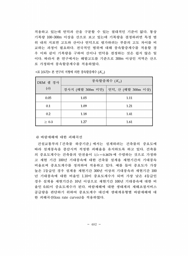 482 적용하고 있는데 언덕과 산을 구분할 수 있는 절대적인 기준이 없다. 통상 기복량 100300m 이상을 산으로 보고 있는데 기복량을 결정하려면 특정 범 위 내의 지표면 고도와 산이나 언덕으로 평가하려는 부분의 고도 차이를 비 교하는 과정이 필요하다. 전국적인 범위에 대해 풍속할증계수를 적용할 경 우 이와 같이 기복량을 구하여 산이나 언덕을 결정하는 것은 쉽지 않은 일 이다. 따라서 본 연구에서는 해발고도를 기준으로 300m 이상인 지역은 산으 로 가정하여 풍속할증계수를 적용하였다. DEM 셀 경사 풍속할증계수 ?? 경사지 해발 300m 미만 언덕, 산 해발 300m 이상 0.05 1.05 1.11 0.1 1.09 1.21 0.2 1.18 1.41 ≥ 1.27 1.61 표 2-5-72 본 연...