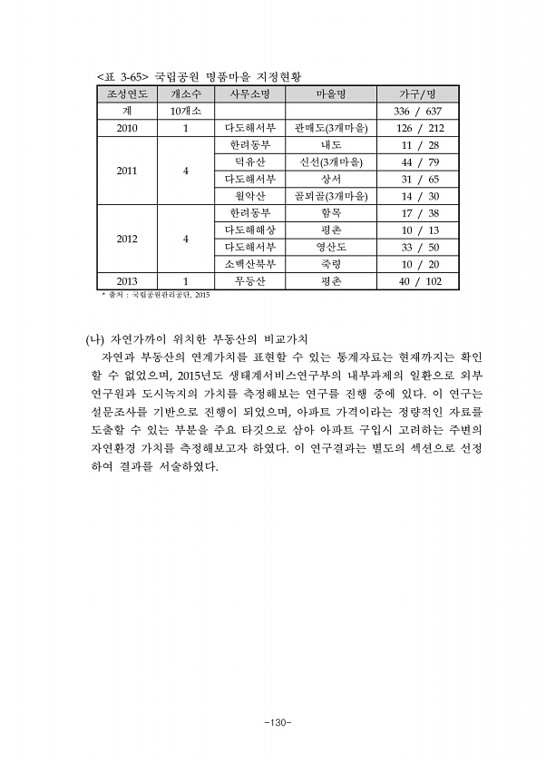 -130- 조성연도 개소수 사무소명 마을명 가구 명 계 개소 다도해서부 관매도 개마을 한려동부 내도 덕유산 신선 개마을 다도해서부 상서 월악산 골뫼골 개마을 한려동부 함목 다도해해상 평촌 다도해서부 영산도 소백산북부 죽령 무등산 평촌 출처 국립공원관리공단 표 국립공원 명품마을 지정현황 나 자연가까이 위치한 부동산의 비교가치 자연과 부동산의 연계가치를 표현할 수 있는 통계자료는 현재까지는 확인 할 수 없었으며 년도 생태계서비스연구부의 내부과제의 일환으로 외부 연구원과 도시녹지의 가치를 측정해보는 연구를 진행 중에 있다 이 연구는 설문조사를 기반으로 진행이 되었으며 아파트 가격이라는 정량적인 자료를 도출할 수 있는 부분을 주요 타깃으로 삼아 아파트 구입시 고려하는 주변의 자연환경 가치를 측정해보고자 하였다 이 ...