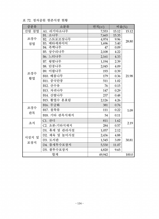 134 중분류 소분류 면적 비율 산림 침엽 리기다소나무 조경수 침엽 소나무 스트로브잣나무 메타세콰이어 측백나무 조경수 활엽 상수리나무 느티나무 왕벚나무 단풍나무 이팝나무 배롱나무 중국단풍 산수유 자귀나무 산딸나무 활엽수 혼효림 조경수 관목 무궁화 철쭉류 기타 관목식재지 초지 잔디 초본 기타식재지 시설지 및 포장지 휴게 및 관리시설 체육 및 놀이시설 도서관 틈새투수포장지 불투수포장지 합계 표 정자공원 현존식생 현황 134