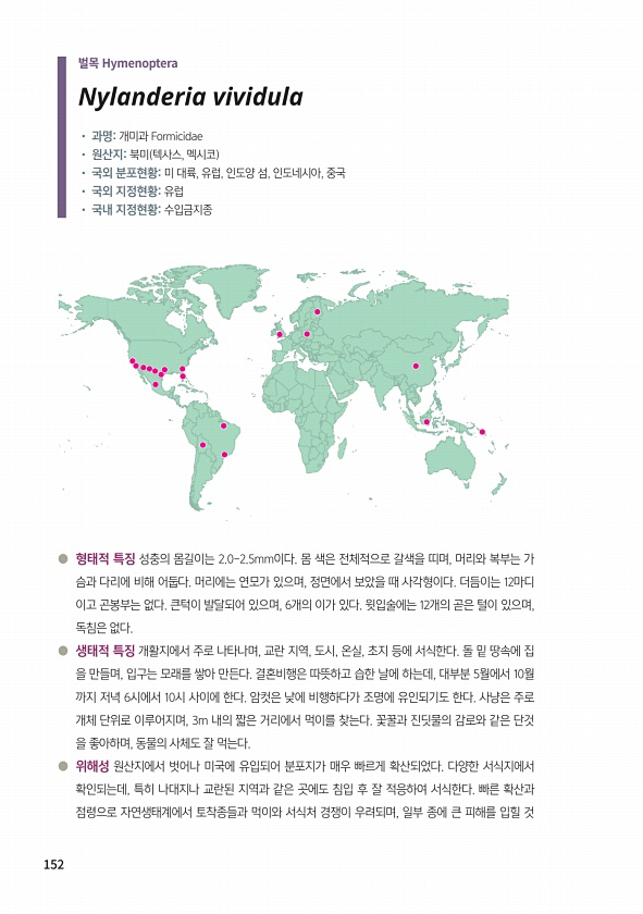 152 ● 형태적 특징 성충의 몸길이는 2.0-2.5mm이다. 몸 색은 전체적으로 갈색을 띠며, 머리와 복부는 가 슴과 다리에 비해 어둡다. 머리에는 연모가 있으며, 정면에서 보았을 때 사각형이다. 더듬이는 12마디 이고 곤봉부는 없다. 큰턱이 발달되어 있으며, 6개의 이가 있다. 윗입술에는 12개의 곧은 털이 있으며, 독침은 없다. ● 생태적 특징 개활지에서 주로 나타나며, 교란 지역, 도시, 온실, 초지 등에 서식한다. 돌 밑 땅속에 집 을 만들며, 입구는 모래를 쌓아 만든다. 결혼비행은 따뜻하고 습한 날에 하는데, 대부분 5월에서 10월 까지 저녁 6시에서 10시 사이에 한다. 암컷은 낮에 비행하다가 조명에 유인되기도 한다. 사냥은 주로 개체 단위로 이루어지며, 3m 내의 짧은 거리에서 먹이를 찾는다....