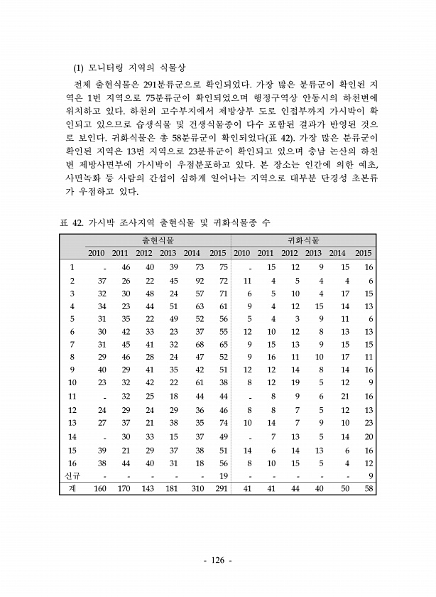 126 1 모니터링 지역의 식물상 전체 출현식물은 291분류군으로 확인되었다. 가장 많은 분류군이 확인된 지 역은 1번 지역으로 75분류군이 확인되었으며 행정구역상 안동시의 하천변에 위치하고 있다. 하천의 고수부지에서 제방상부 도로 인접부까지 가시박이 확 인되고 있으므로 습생식물 및 건생식물종이 다수 포함된 결과가 반영된 것으 로 보인다. 귀화식물은 총 58분류군이 확인되었다 표 42 가장 많은 분류군이 확인된 지역은 13번 지역으로 23분류군이 확인되고 있으며 충남 논산의 하천 변 제방사면부에 가시박이 우점분포하고 있다. 본 장소는 인간에 의한 예초, 사면녹화 등 사람의 간섭이 심하게 일어나는 지역으로 대부분 단경성 초본류 가 우점하고 있다. 출현식물 귀화식물 2010 2011 2012 2013 2014 ...