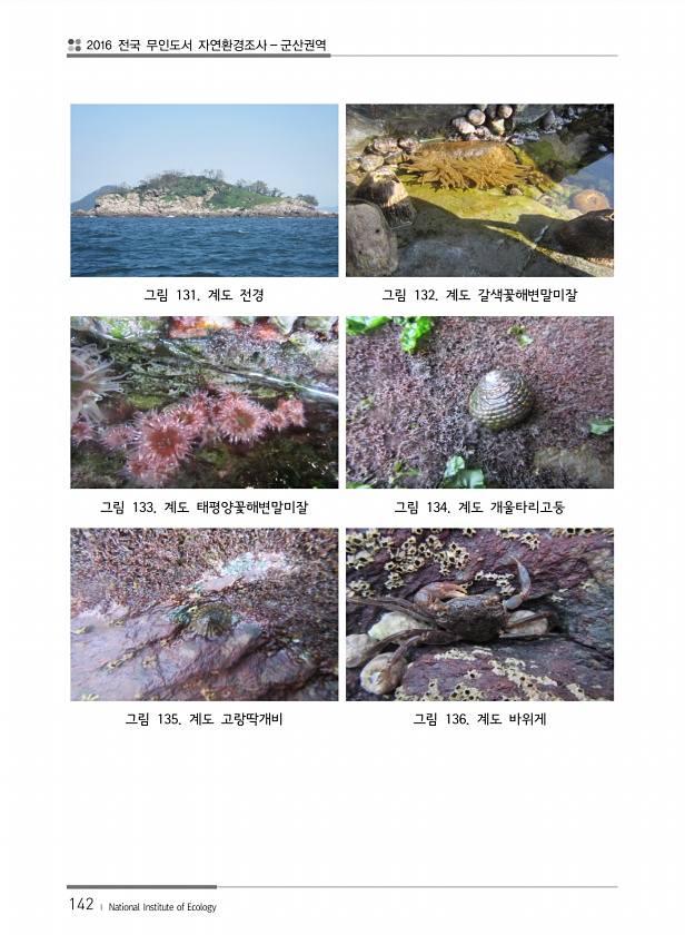 2016 전국 무인도서 자연환경조사 군산권역 142 ? National Institute of Ecology 그림 131. 계도 전경 그림 132. 계도 갈색꽃해변말미잘 그림 133. 계도 태평양꽃해변말미잘 그림 134. 계도 개울타리고둥 그림 135. 계도 고랑딱개비 그림 136. 계도바위게
