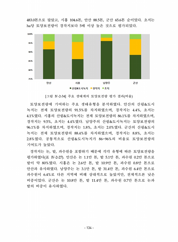 483.0톤으로 많았고, 시흥 104.6톤, 안산 88.5톤, 군산 65.6톤 순이었다. 초지는 ha당 토양보전량이 경작지보다 5배 이상 높은 것으로 평가되었다. [그림 Ⅳ-2-34] 주요 생태계의 토양보전량 평가 결과 비율 토양보전량에 기여하는 주요 생태유형을 분석하였다. 안산의 산림&도시 녹지는 전체 토양보전량의 91.5%를 차지하였으며, 경작지는 4.4%, 초지는 4.1%였다. 시흥의 산림&도시녹지는 전체 토양보전량의 86.1%를 차지하였으며, 경작지는 9.5%, 초지는 4.4%였다. 남양주의 산림&도시녹지는 토양보전량의 96.1%를 차지하였으며, 경작지는 1.8%, 초지는 2.0%였다. 군산의 산림&도시 녹지는 전체 토양보전량의 88.4%를 차지하였으며, 경작지는 8.8%, 초지는 2.8%였다. 공통...