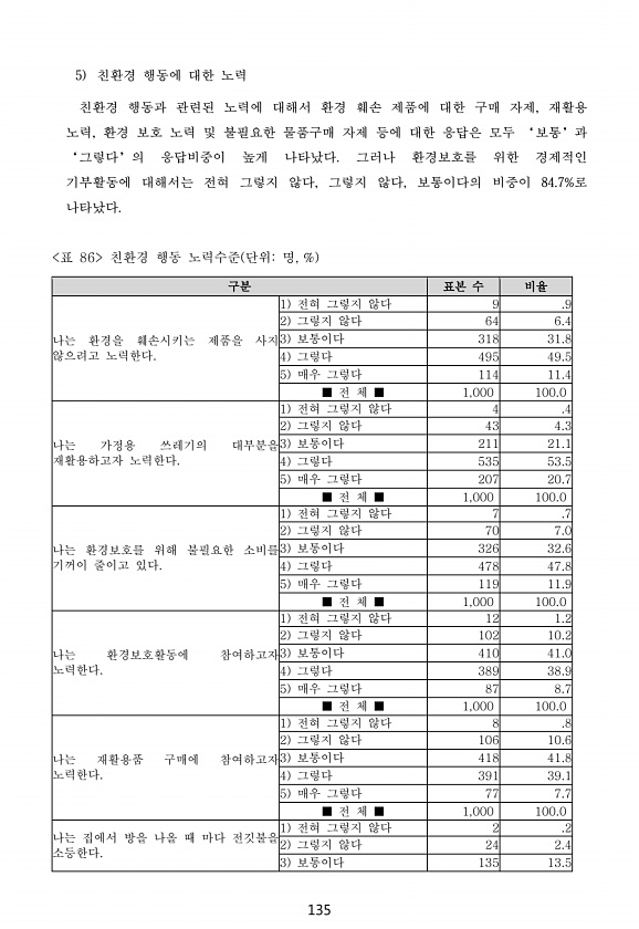 135 5 친환경 행동에 대한 노력 친환경 행동과 관련된 노력에 대해서 환경 훼손 제품에 대한 구매 자제, 재활용 노력, 환경 보호 노력 및 불필요한 물품구매 자제 등에 대한 응답은 모두 ‘보통’과 ‘그렇다’의 응답비중이 높게 나타났다. 그러나 환경보호를 위한 경제적인 기부활동에 대해서는 전혀 그렇지 않다, 그렇지 않다, 보통이다의 비중이 84.7%로 나타났다. 표 86 친환경 행동 노력수준 단위명, % 구분 표본 수 비율 나는 환경을 훼손시키는 제품을 사지 않으려고 노력한다. 1 전혀 그렇지 않다 9 .9 2 그렇지 않다 64 6.4 3 보통이다 318 31.8 4 그렇다 495 49.5 5 매우 그렇다 114 11.4 ■ 전 체 ■ 1,000 100.0 나는 가정용 쓰레기의 대부분을 재활용하고자 노력한다...