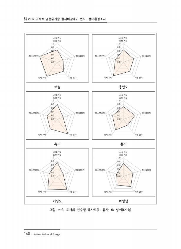 2017 국제적 멸종위기종 뿔제비갈매기 번식·생태환경조사 140 ? National Institute of Ecology 매섬 동만도 흑도 홍도 어평도 하벌섬 그림 Ⅳ-3. 도서의 변수별 유사도 1유사, 0상이 계속