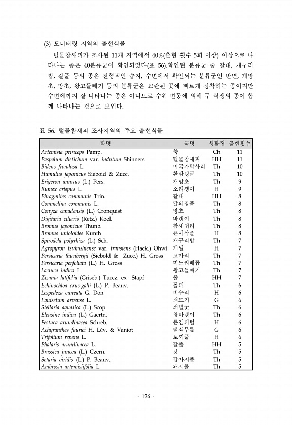 126 3 모니터링 지역의 출현식물 털물참새피가 조사된 11개 지역에서 40% 출현 횟수 5회 이상 이상으로 나 타나는 종은 40분류군이 확인되었다 표 56 .확인된 분류군 중 갈대, 개구리 밥, 갈풀 등의 종은 전형적인 습지, 수변에서 확인되는 분류군인 반면, 개망 초, 망초, 왕고들빼기 등의 분류군은 교란된 곳에 빠르게 정착하는 종이지만 수변에까지 잘 나타나는 종은 아니므로 수위 변동에 의해 두 식생의 종이 함 께 나타나는 것으로 보인다. 학명 국명 생활형 출현횟수 Artemisia princeps Pamp. 쑥 Ch 11 Paspalum distichum var. indutum Shinners 털물참새피 HH 11 Bidens frondosa L. 미국가막사리 Th 10 Humulus japonicus...