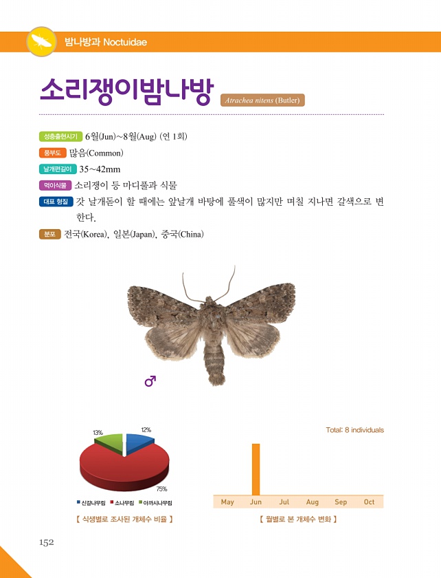152 밤나방과 Noctuidae 성충출현시기 6월 Jun 8월 Aug 연 1회 풍부도 많음 Common 날개편길이 3542mm 먹이식물 소리쟁이 등 마디풀과 식물 대표 형질 갓 날개돋이 할 때에는 앞날개 바탕에 풀색이 많지만 며칠 지나면 갈색으로 변 한다. 분포 전국 Korea , 일본 Japan , 중국 China 소리쟁이밤나방 Atrachea nitens Butler 【 월별로 본 개체수 변화 】 Total8 individuals May Jun Jul Aug Sep Oct 【 식생별로 조사된 개체수 비율 】 13% 신갈나무림 소나무림 아까시나무림 12%75%