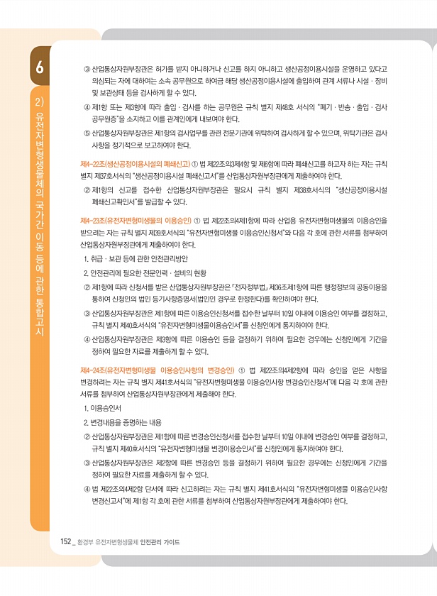 152 _ 환경부 유전자변형생물체 안전관리 가이드 6 유전자변형생물체의 국가간 이동 등에 관한 통합고시 2 ③ 산업통상자원부장관은 허가를 받지 아니하거나 신고를 하지 아니하고 생산공정이용시설을 운영하고 있다고 의심되는 자에 대하여는 소속 공무원으로 하여금 해당 생산공정이용시설에 출입하여 관계 서류나 시설·장비 및 보관상태 등을 검사하게 할 수 있다. ④ 제1항 또는 제3항에 따라 출입·검사를 하는 공무원은 규칙 별지 제48호 서식의 “폐기·반송·출입·검사 공무원증”을 소지하고 이를 관계인에게 내보여야 한다. ⑤ 산업통상자원부장관은 제1항의 검사업무를 관련 전문기관에 위탁하여 검사하게 할 수 있으며, 위탁기관은 검사 사항을 정기적으로 보고하여야 한다. 제4-22조 생산공정이용시설의 폐쇄신고 ① 법 제22조의3...
