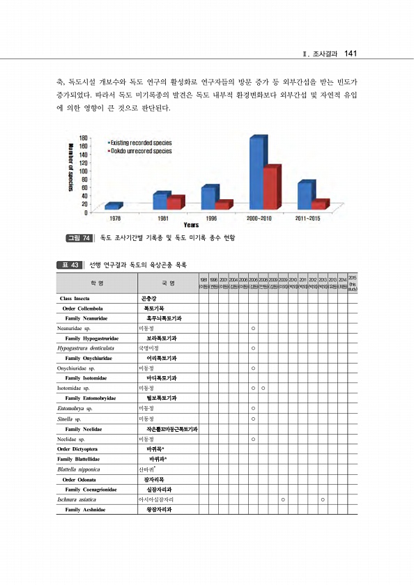 Ⅱ. 조사결과 141 축, 독도시설 개보수와 독도 연구의 활성화로 연구자들의 방문 증가 등 외부간섭을 받는 빈도가 증가되었다. 따라서 독도 미기록종의 발견은 독도 내부적 환경변화보다 외부간섭 및 자연적 유입 에 의한 영향이 큰 것으로 판단된다. 그림 74 독도 조사기간별 기록종 및 독도 미기록 종수 현황 학 명 국 명 1981 이등 1996 권등 2001 이등 2004 김등 2006 이등 2006 김등 2008 안등 2009 김등 2009 이외 2010 박외 2011 박외 2012 박외 2013 박외 2013 유등 2014 최등 2015 this study Class Insecta 곤충강 Order Collembola 톡토기목 Family Neanuridae 혹무늬톡토기과 Neanuridae sp. 미동정 ...