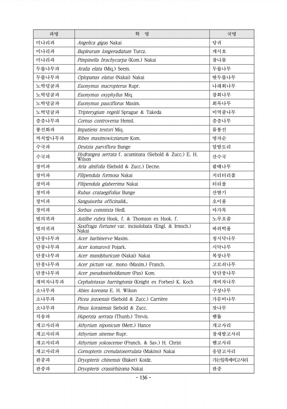 과명 학 명 국명 미나리과 Angelica gigas Nakai 당귀 미나리과 Bupleurum longeradiatum Turcz. 개시호 미나리과 Pimpinella brachycarpa Kom. Nakai 참나물 두릅나무과 Aralia elata Miq. Seem. 두릅나무 두릅나무과 Oplopanax elatus Nakai Nakai 땃두릅나무 노박덩굴과 Euonymus macropterus Rupr. 나래회나무 노박덩굴과 Euonymus oxyphyllus Miq. 참회나무 노박덩굴과 Euonymus pauciflorus Maxim. 회목나무 노박덩굴과 Tripterygium regelii Sprague & Takeda 미역줄나무 층층나무과 Cornus controversa Hemsl. 층층나무 봉...