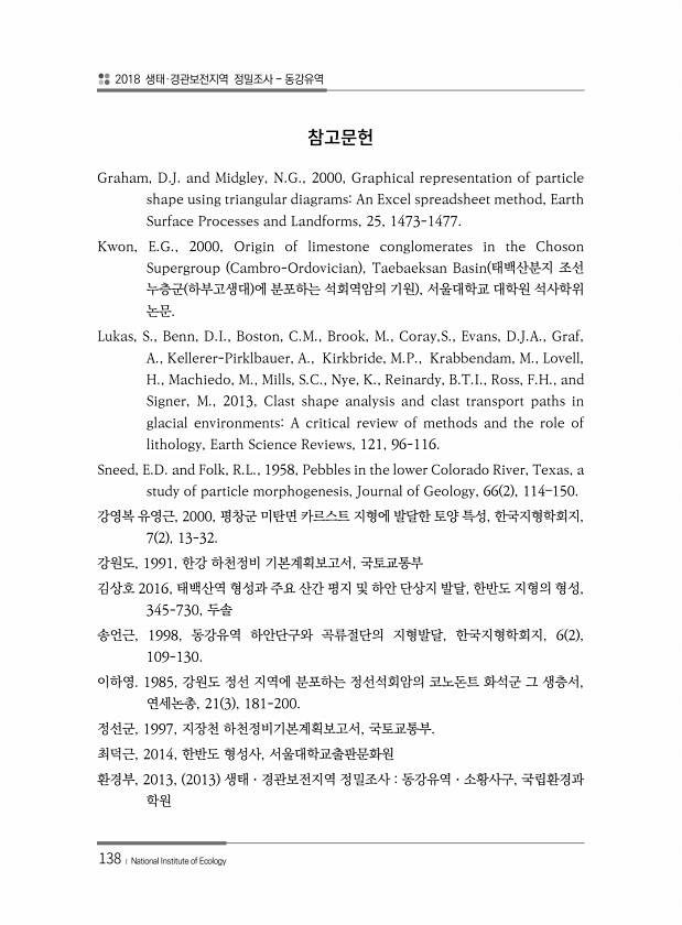 2018 생태·경관보전지역 정밀조사 동강유역 138 ? National Institute of Ecology Graham, D.J. and Midgley, N.G., 2000, Graphical representation of particle shape using triangular diagramsAn Excel spreadsheet method, Earth Surface Processes and Landforms, 25, 1473-1477. Kwon, E.G., 2000, Origin of limestone conglomerates in the Choson Supergroup Cambro-Ordovician , Taebaeksan Basin 태백산분지 조선 누층군 하부고생대 에 분포하는 석회역암의 기원 ,...