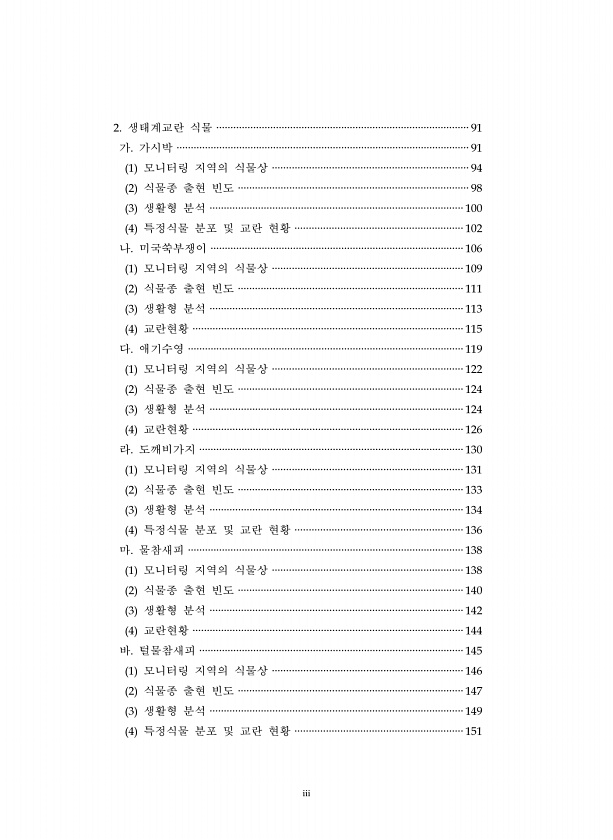 iii 2. 생태계교란 식물 ·························································································91 가. 가시박 ·······································································································91 1 모니터링 지역의 식물상 ·····································································94 2 식물종 출현 빈도 ················································································...
