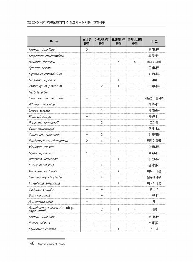 2016 생태·경관보전지역 정밀조사 하시동 · 안인사구 140 ? National Institute of Ecology 구 분 소나무 군락 아까시나무 군락 물오리나무 군락 족제비싸리 군락 비 고 Lindera obtusiloba 2 생강나무 Lespedeza maximowiczii 1 조록싸리 Amorpha fruticosa 3 4 족제비싸리 Quercus serrata 1 졸참나무 Ligustrum obtusifolium 1 쥐똥나무 Dioscorea japonica + 참마 Zanthoxylum piperitum 2 1 초피나무 Herb layer H Carex humilis var. nana + 가는잎그늘사초 Athyrium...