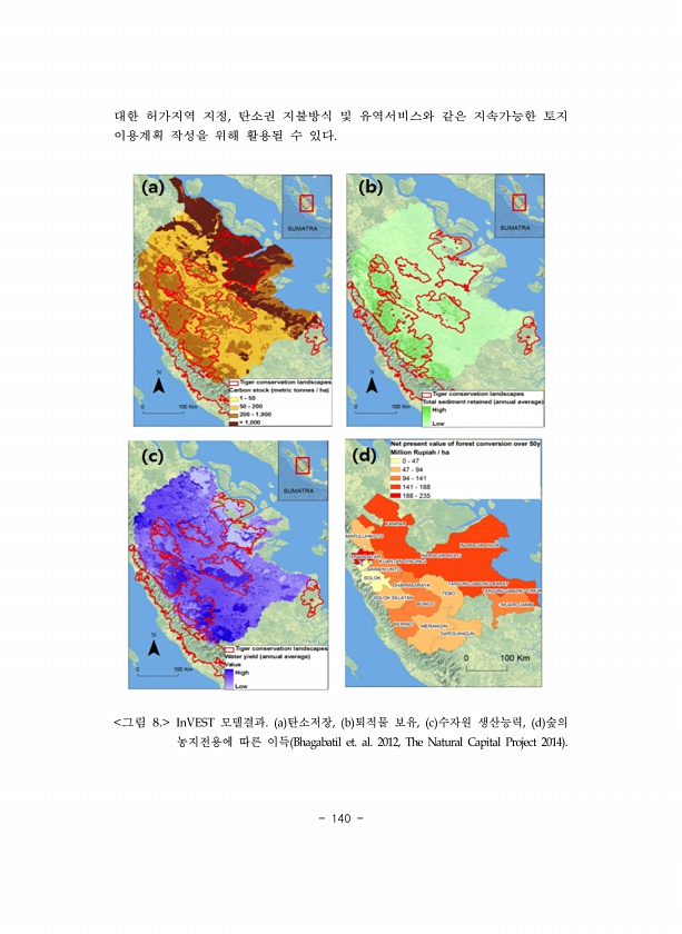 140 대한 허가지역 지정 탄소권 지불방식 및 유역서비스와 같은 지속가능한 토지 이용계획 작성을 위해 활용될 수 있다 그림 모델결과 탄소저장 퇴적물 보유 수자원 생산능력 숲의 농지전용에 따른이득