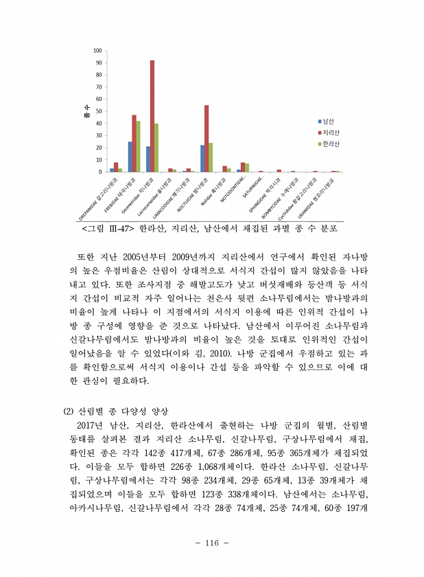 116 그림 Ⅲ-47 한라산, 지리산, 남산에서 채집된 과별 종 수 분포 또한 지난 2005년부터 2009년까지 지리산에서 연구에서 확인된 자나방 의 높은 우점비율은 산림이 상대적으로 서식지 간섭이 많지 않았음을 나타 내고 있다. 또한 조사지점 중 해발고도가 낮고 버섯재배와 등산객 등 서식 지 간섭이 비교적 자주 일어나는 천은사 뒷편 소나무림에서는 밤나방과의 비율이 높게 나타나 이 지점에서의 서식지 이용에 따른 인위적 간섭이 나 방 종 구성에 영향을 준 것으로 나타났다. 남산에서 이루어진 소나무림과 신갈나무림에서도 밤나방과의 비율이 높은 것을 토대로 인위적인 간섭이 일어났음을 알 수 있었다 이와 김, 2010 나방 군집에서 우점하고 있는 과 를 확인함으로써 서식지 이용이나 간섭 등을 파악할 수 있으므로 이에...