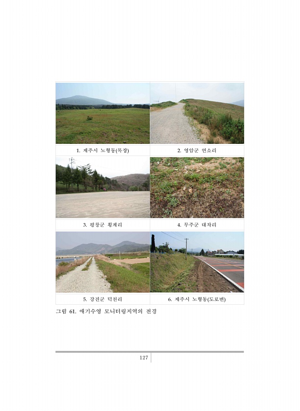 127 1. 제주시 노형동 목장 2. 영암군 연소리 3. 평창군 횡계리 4. 무주군 대차리 5. 강진군 덕천리 6. 제주시 노형동 도로변 그림 61. 애기수영 모니터링지역의전경