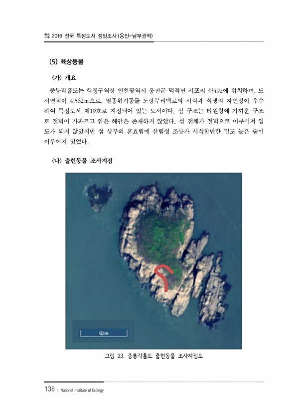 2016 전국 특정도서 정밀조사 옹진-남부권역 138 ? National Institute of Ecology 5 육상동물 가 개요 중통각흘도는 행정구역상 인천광역시 옹진군 덕적면 서포리 산492에 위치하며, 도 서면적이 4,562㎡으로, 멸종위기동물 노랑부리백로의 서식과 식생의 자연성이 우수 하여 특정도서 제19호로 지정되어 있는 도서이다. 섬 구조는 타원형에 가까운 구조 로 절벽이 가파르고 얕은 해안은 존재하지 않았다. 섬 전체가 절벽으로 이루어져 입 도가 되지 않았지만 섬 상부의 혼효림에 산림성 조류가 서식할만한 밀도 높은 숲이 이루어져 있었다. 나 출현동물 조사지점 그림 23. 중통각흘도 출현동물조사지점도