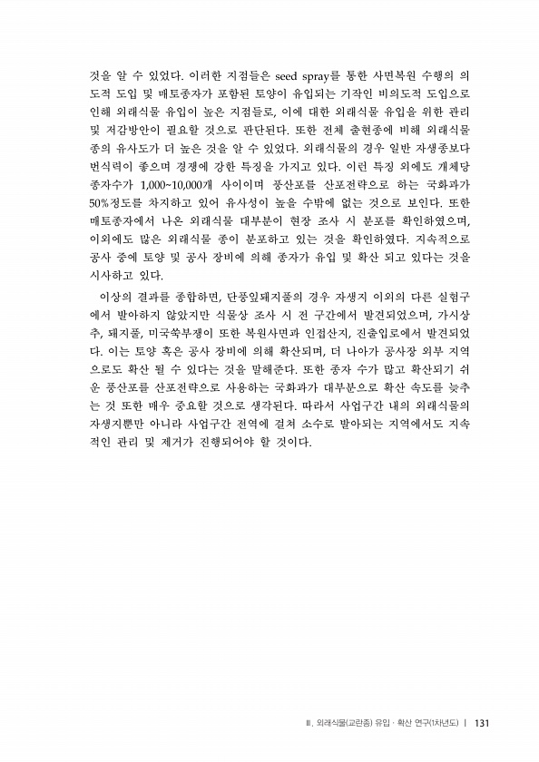 것을 알 수 있었다 이러한 지점들은 를 통한 사면복원 수행의 의 도적 도입 및 매토종자가 포함된 토양이 유입되는 기작인 비의도적 도입으로 인해 외래식물 유입이 높은 지점들로 이에 대한 외래식물 유입을 위한 관리 및 저감방안이 필요할 것으로 판단된다 또한 전체 출현종에 비해 외래식물 종의 유사도가 더 높은 것을 알 수 있었다 외래식물의 경우 일반 자생종보다 번식력이 좋으며 경쟁에 강한 특징을 가지고 있다 이런 특징 외에도 개체당 종자수가 개 사이이며 풍산포를 산포전략으로 하는 국화과가 정도를 차지하고 있어 유사성이 높을 수밖에 없는 것으로 보인다 또한 매토종자에서 나온 외래식물 대부분이 현장 조사 시 분포를 확인하였으며 이외에도 많은 외래식물 종이 분포하고 있는 것을 확인하였다 지속적으로 공사 중에 토양 및 ...