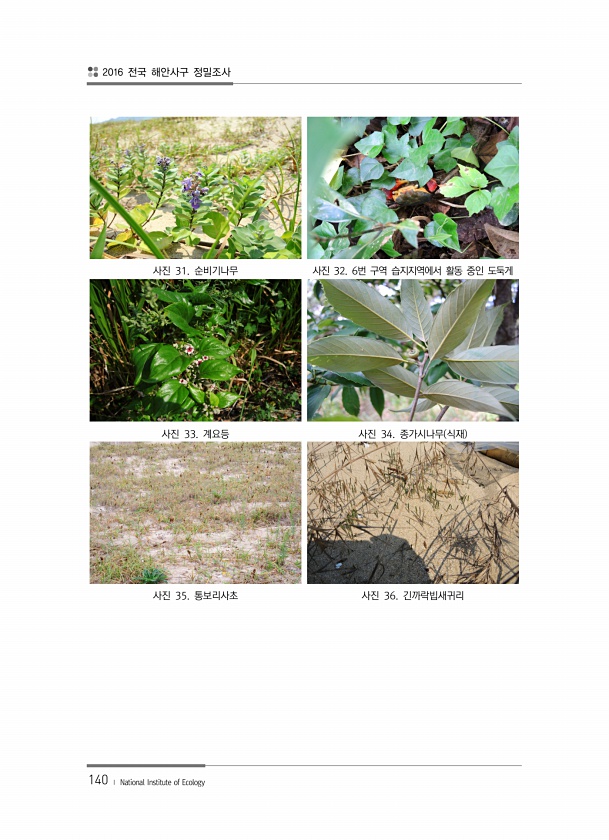 2016 전국 해안사구 정밀조사 140 ? National Institute of Ecology 사진 31. 순비기나무 사진 32. 6번 구역 습지지역에서 활동 중인 도둑게 사진 33. 계요등 사진 34. 종가시나무 식재 사진 35. 통보리사초 사진 36.긴까락빕새귀리
