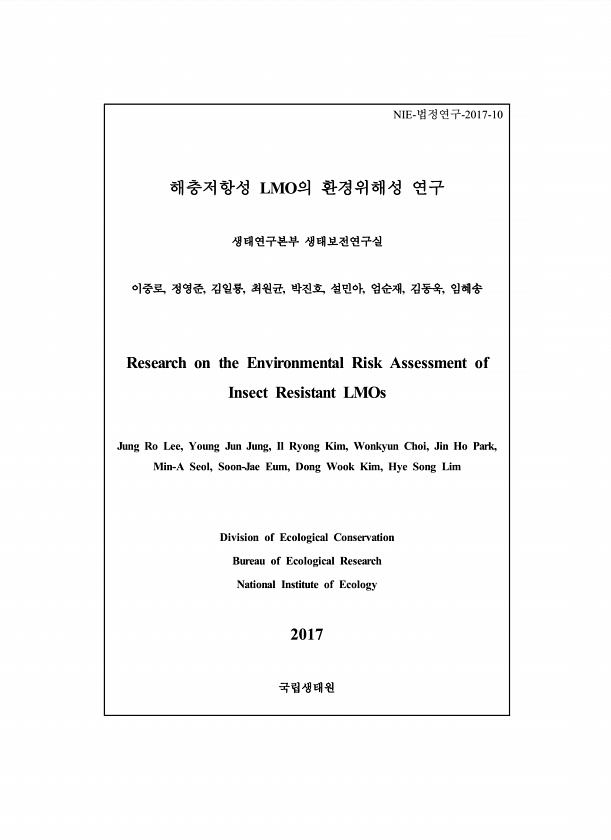 NIE-법정연구-2017-10 해충저항성 LMO의 환경위해성 연구 생태연구본부 생태보전연구실 이중로, 정영준, 김일룡, 최원균, 박진호, 설민아, 엄순재, 김동욱, 임혜송 Research on the Environmental Risk Assessment of Insect Resistant LMOs Jung Ro Lee, Young Jun Jung, Il Ryong Kim, Wonkyun Choi, Jin Ho Park, Min-A Seol, Soon-Jae Eum, Dong Wook Kim, Hye Song Lim Division of Ecological Conservation Bureau of Ecological Research National Institute of Ecology 2017국립생태원