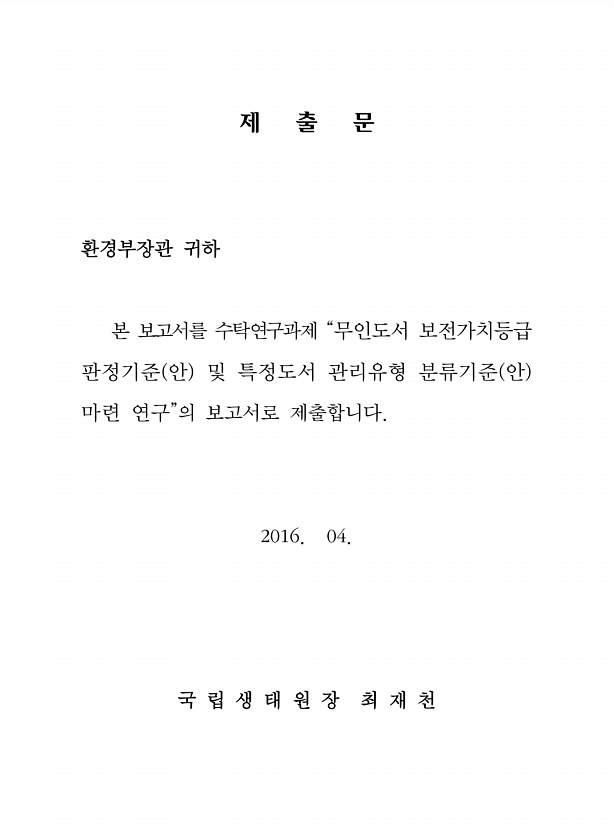 제 출 문 환경부장관 귀하 본 보고서를 수탁연구과제 “무인도서 보전가치등급 판정기준 안 및 특정도서 관리유형 분류기준 안 마련 연구”의 보고서로 제출합니다. 2016. 04. 국 립 생 태 원 장 최 재천