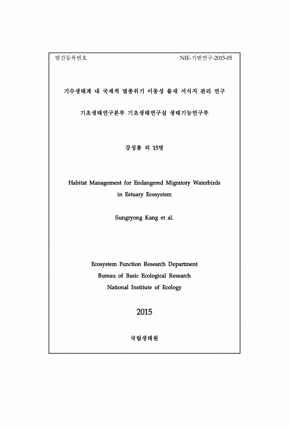 발간등록번호 NIE-기반연구-2015-05 기수생태계 내 국제적 멸종위기 이동성 물새 서식지 관리 연구 기초생태연구본부 기초생태연구실 생태기능연구부 강성룡 외 15명 Habitat Management for Endangered Migratory Waterbirds in Estuary Ecosystem Sungryong Kang et al. Ecosystem Function Research Department Bureau of Basic Ecological Research National Institute of Ecology 2015국립생태원