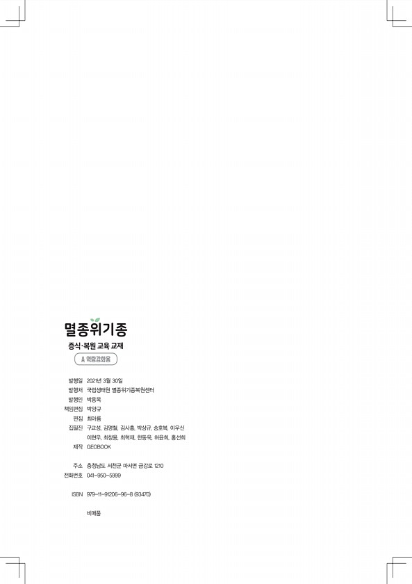 발행일 2021년 3월 30일 발행처 국립생태원 멸종위기종복원센터 발행인 박용목 책임편집 박양규 편집 최아름 집필진 구교성, 김명철, 김사흥, 박상규, 송호복, 이우신 이현우, 최창용, 최혁재, 한동욱, 허윤희, 홍선희 제작 GEOBOOK 주소 충청남도 서천군 마서면 금강로 1210 전화번호 041-950-5999 ISBN 979-11-91206-96-8 93470 비매품 A 역량강화용 멸종위기종 증식·복원 교육교재