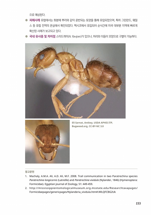 153 으로 예상된다. ● 피해사례 유럽에서는 화분에 뿌리와 같이 운반되는 토양을 통해 유입되었으며, 특히 그린란드, 웨일 스 등 유럽 전역의 온실에서 확인되었다. 멕시코에서 유입되어 순식간에 미국 대부분 지역에 빠르게 확산된 사례가 보고되고 있다. ● 국내 유사종 및 차이점 스미드개미 N. flavipes 가 있으나, 머리와 더듬이 모양으로 구별이 가능하다. 참고문헌 1. Machaly, A.M.A. Ali, A.D. Ali, M.F. 2008. Trail communication in two Paratrechina species Paratrechina longicornis Latreille and Paratrechina vividula Nylander, 1846 HymenopteraFormicidae E...