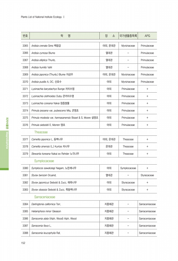 152 번호 학 명 장 소 국가생물종목록 APG 피자식물문 Magnoliophyta Plants List of National Institute Ecology Ⅰ 3365 Ardisia crenata Sims 백량금 야외, 온대관 Myrsinaceae Primulaceae 3366 Ardisia cymosa Blume 열대관 Primulaceae 3367 Ardisia elliptica Thunb. 열대관 Primulaceae 3368 Ardisia humilis Vahl 열대관 Primulaceae 3369 Ardisia japonica Thunb. Blume 자금우 야외, 온대관 Myrsinaceae Primulaceae 3370 Ardisia pusilla A. DC. 산호수 야외 Myrsinaceae...