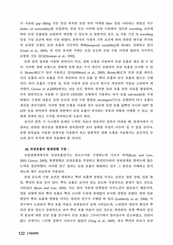 서 사용된 식은 연간 축적된 토양 위의 미세한 양을 나타내는 계절성 지수 를 도입하여 토양 온도 이외에 토양 수분량의 정도와 조건에 따라 토양 호흡량을 조절하여 계산할 수 있도록 일반적인 경우 가뭄 기간 등을 기상 조건에 따라 구분 하였다 관측지의 식생과 기후 조건에 따라 관련된 변수를 추가하 여 보정된 모형은 토양 호흡의 시간적인 변화 를 설명하고 있다 또 다른 유사한 식에는 토양 온도와 토양 수분 이외에 엽면적 지수까지 포함한 식도 있다 또한 관측 결과를 이용한 관계식이 아닌 생태 모형을 이용하여 토양 호흡을 계산 할 수 있 다 이러한 생태 모형으로 생태계 전체 탄소 수지 계산이 포함되어 토양 호흡을 모사할 수 있 는 가 널리 사용되고 있다 의 토양 호흡 계산은 자가 호흡과 타가 호흡을 각각 계산하여 자...