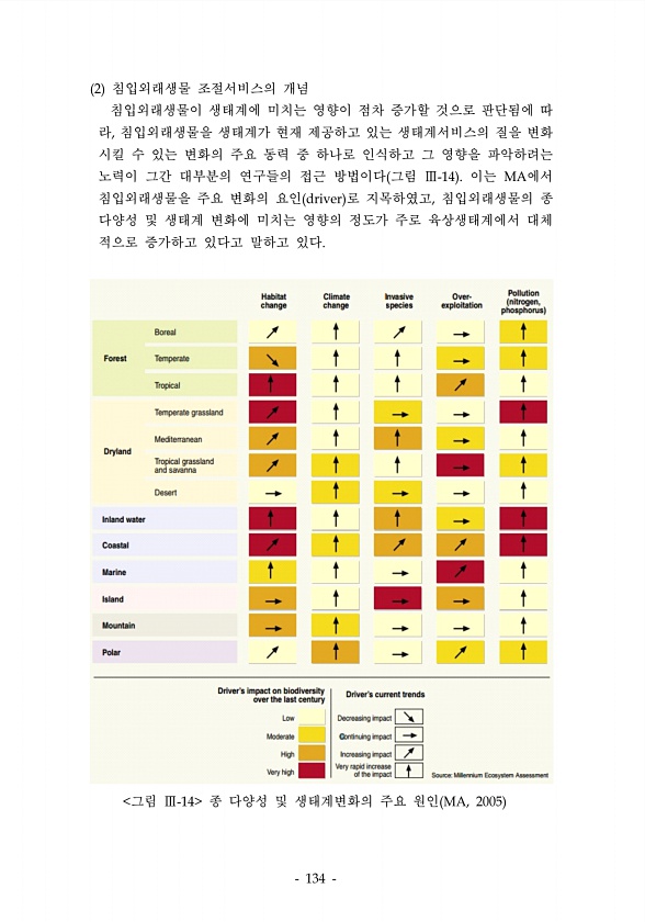 침입외래생물 조절서비스의 개념 침입외래생물이 생태계에 미치는 영향이 점차 증가할 것으로 판단됨에 따 라 침입외래생물을 생태계가 현재 제공하고 있는 생태계서비스의 질을 변화 시킬 수 있는 변화의 주요 동력 중 하나로 인식하고 그 영향을 파악하려는 노력이 그간 대부분의 연구들의 접근 방법이다 그림 이는 에서 침입외래생물을 주요 변화의 요인 로 지목하였고 침입외래생물의 종 다양성 및 생태계 변화에 미치는 영향의 정도가 주로 육상생태계에서 대체 적으로 증가하고 있다고 말하고 있다 그림 종 다양성 및 생태계변화의 주요원인