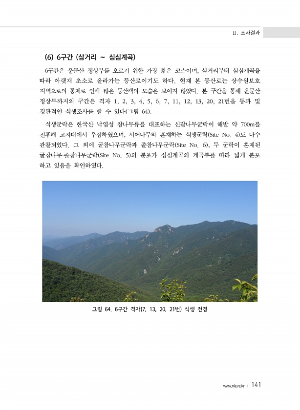 Ⅱ. 조사결과 www.nie.re.kr ? 141 6 6구간 삼거리 ∼ 심심계곡 6구간은 운문산 정상부를 오르기 위한 가장 짧은 코스이며, 삼거리부터 심심계곡을 따라 아랫재 초소로 올라가는 등산로이기도 하다. 현재 본 등산로는 상수원보호 지역으로의 통제로 인해 많은 등산객의 모습은 보이지 않았다. 본 구간을 통해 운문산 정상부까지의 구간은 격자 1, 2, 3, 4, 5, 6, 7, 11, 12, 13, 20, 21번을 통과 및 경관적인 식생조사를 할 수 있다 그림 64 식생군락은 한국산 낙엽성 참나무류를 대표하는 신갈나무군락이 해발 약 700m를 전후해 고지대에서 우점하였으며, 서어나무와 혼재하는 식생군락 Site No. 4 도 다수 관찰되었다. 그 외에 굴참나무군락과 졸참나무군락 Site No. 6 , 두...