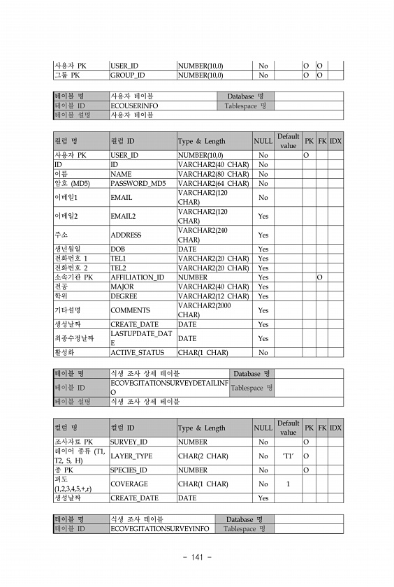 141 사용자 PK USER_ID NUMBER 10,0 No O O 그룹 PK GROUP_ID NUMBER 10,0 No O O 테이블 명 사용자 테이블 Database 명 테이블 ID ECOUSERINFO Tablespace 명 테이블 설명 사용자 테이블 컬럼 명 컬럼 ID Type & Length NULL Default value PK FK IDX 사용자 PK USER_ID NUMBER 10,0 No O ID ID VARCHAR2 40 CHAR No 이름 NAME VARCHAR2 80 CHAR No 암호 MD5 PASSWORD_MD5 VARCHAR2 64 CHAR No 이메일1 EMAIL VARCHAR2 120 CHAR No 이메일2 EMAIL2 VARCHAR2 120 CHAR Yes 주소 ADDRESS...