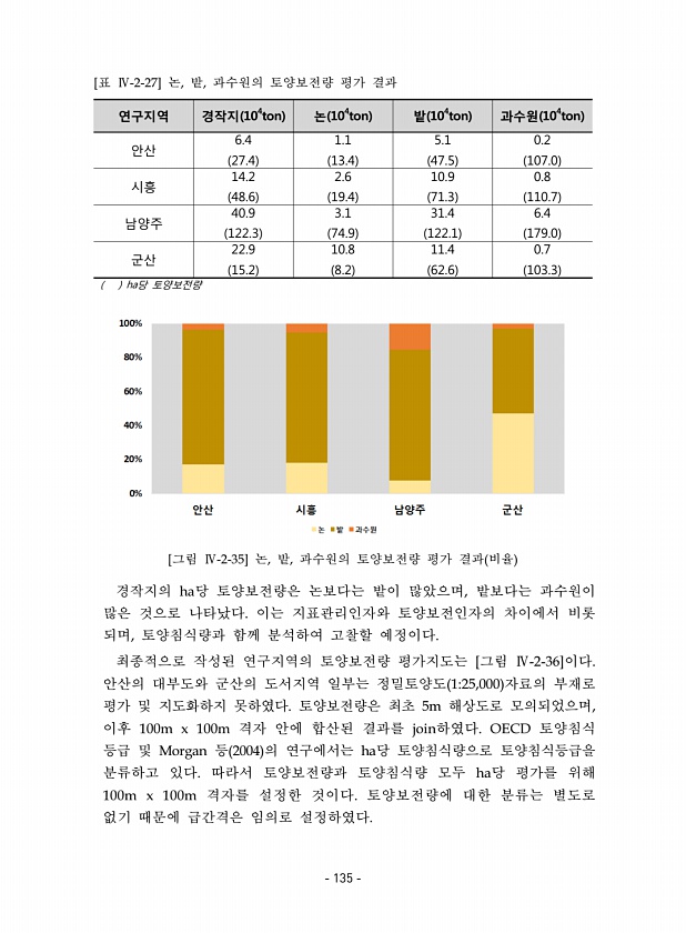 연구지역 경작지 104ton 논 104ton 밭 104ton 과수원 104ton 안산 6.4 27.4 1.1 13.4 5.1 47.5 0.2 107.0 시흥 14.2 48.6 2.6 19.4 10.9 71.3 0.8 110.7 남양주 40.9 122.3 3.1 74.9 31.4 122.1 6.4 179.0 군산 22.9 15.2 10.8 8.2 11.4 62.6 0.7 103.3 ha당 토양보전량 [표 Ⅳ-2-27] 논, 밭, 과수원의 토양보전량 평가 결과 [그림 Ⅳ-2-35] 논, 밭, 과수원의 토양보전량 평가 결과 비율 경작지의 ha당 토양보전량은 논보다는 밭이 많았으며, 밭보다는 과수원이 많은 것으로 나타났다. 이는 지표관리인자와 토양보전인자의 차이에서 비롯 되며, 토양침식량과 함께 분석하여 고찰할 예...