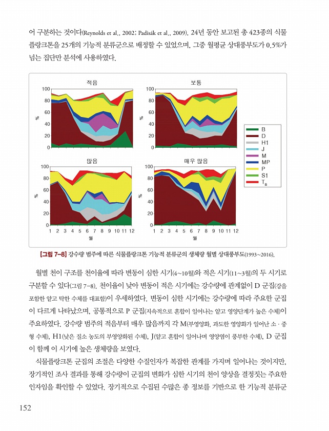 152 어 구분하는 것이다 Reynolds et al., 2002; Padis?k et al., 2009 24년 동안 보고된 총 423종의 식물 플랑크톤을 25개의 기능적 분류군으로 배정할 수 있었으며, 그중 월평균 상대풍부도가 0.5%가 넘는 집단만 분석에 사용하였다. [그림 7-8] 강수량 범주에 따른 식물플랑크톤 기능적 분류군의 생체량 월별 상대풍부도 19932016 월별 천이 구조를 천이율에 따라 변동이 심한 시기 410월 와 적은 시기 113월 의 두 시기로 구분할 수 있다 그림 7-8 천이율이 낮아 변동이 적은 시기에는 강수량에 관계없이 D 군집 강을 포함한 얕고 탁한 수체를 대표함 이 우세하였다. 변동이 심한 시기에는 강수량에 따라 주요한 군집 이 다르게 나타났으며, 공통적으로 P 군집 지속적으...