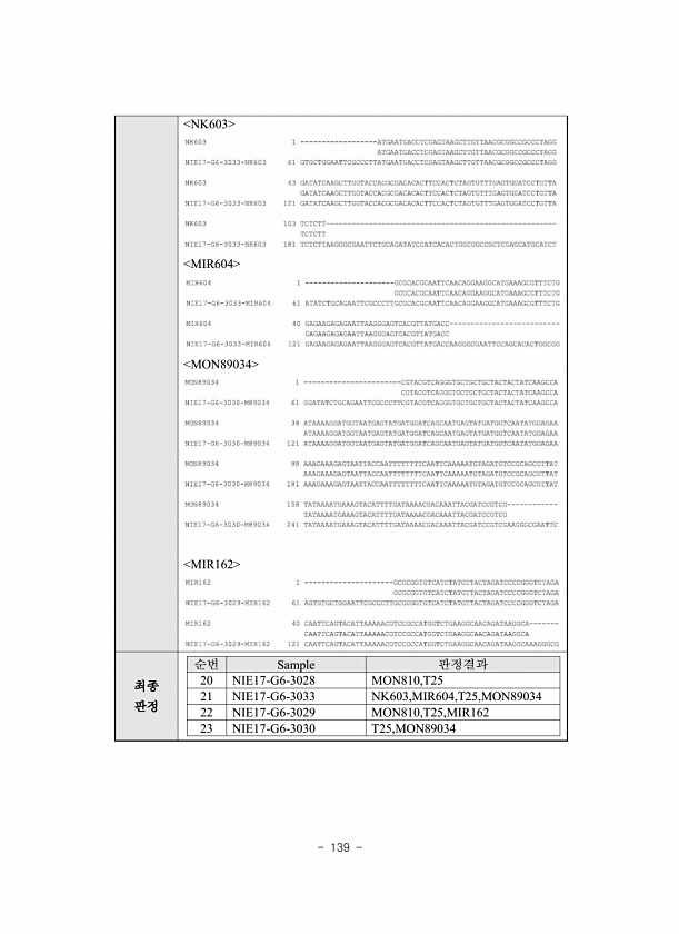 139 NK603 MIR604 MON89034 MIR162 최종 판정 순번 Sample 판정결과 20 NIE17-G6-3028 MON810,T25 21 NIE17-G6-3033 NK603,MIR604,T25,MON89034 22 NIE17-G6-3029 MON810,T25,MIR162 23 NIE17-G6-3030T25,MON89034