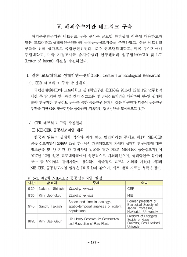 137 표 제 회 공동심포지엄 일정 V. 해외우수기관 네트워크 구축 해외우수연구기관 네트워크 구축 분야는 글로벌 환경생태 이슈에 대응하고자 일본 교토대학교 생태학연구센터 와 국제공동심포지움을 추진하였고, 신규 네트워크 구축을 위해 싱가포르 국립공원위원회, 호주 퀸즈랜드대학교, 미국 루이지애나 주립대학교, 미국 지질조사국 습지?수생태 연구센터와 업무협약 MOU 및 LOI Letter of Intent 체결을 추진하였다. 1. 일본 교토대학교 생태학연구센터 CER, Center for Ecological Research 가. CER 네트워크 구축 추진개요 국립생태원 NIE 와 교토대학교 생태학연구센터 CER 은 2016년 12월 1일 업무협약 체결 후 양 기관 연구자들 간의 상호교류 및 공동심포지엄을 개최하여 ...