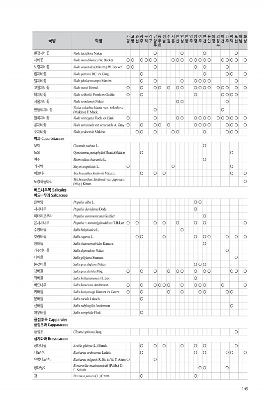149 흰젖제비꽃 Viola lactifora Nakai ○ ○ ○ ○ 제비꽃 Viola mandshurica W. Becker ○ ○ ○ ○ ○ ○ ○ ○ ○ ○ ○ ○ ○ ○ ○ ○ ○ ○ ○ 노랑제비꽃 Viola orientalis Maxim. W. Becker ○ ○ ○ ○ ○ ○ 흰제비꽃 Viola patrinii DC. ex Ging. ○ ○ ○ ○ ○ 털제비꽃 Viola phalacrocarpa Maxim. ○ ○ ○ ○ ○ ○ ○ ○ 고깔제비꽃 Viola rossii Hemsl. ○ ○ ○ ○ ○ ○ ○ ○ ○ ○ ○ ○ ○ ○ ○ ○ 뫼제비꽃 Viola selkirkii Pursh ex Goldie ○ ○ ○ ○ ○ ○ ○ 서울제비꽃 Viola seoulensis Nakai ○ ○ ○ 민둥뫼...