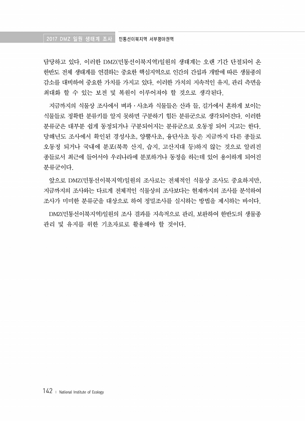 2017 DMZ 일원 생태계 조사 민통선이북지역 서부평야권역 142 ? National Institute of Ecology 담당하고 있다. 이러한 DMZ 민통선이북지역 일원의 생태계는 오랜 기간 단절되어 온 한반도 전체 생태계를 연결하는 중요한 핵심지역으로 인간의 간섭과 개발에 따른 생물종의 감소를 대비하여 중요한 가치를 가지고 있다. 이러한 가치의 지속적인 유지, 관리 측면을 최대화 할 수 있는 보전 및 복원이 이루어져야 할 것으로 생각된다. 지금까지의 식물상 조사에서 벼과·사초과 식물들은 산과 들, 길가에서 흔하게 보이는 식물들로 정확한 분류키를 알지 못하면 구분하기 힘든 분류군으로 생각되어진다. 이러한 분류군은 대부분 쉽게 동정되거나 구분되어지는 분류군으로 오동정 되어 지고는 한다. 당해년도 조사에서...