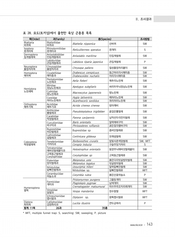 Ⅱ. 조사결과 www.nie.re.kr ? 143 목 Order 과 Family 종 Species 조사방법 Blattaria 바퀴목 Blattellidae 바퀴과 Blattella nipponica 산바퀴 SW Isoptera 흰개미목 Rhinotermitidae 흰개미과 Reticulitermes speratus 흰개미 S Dermaptera 집게벌레목 Anisolabididae 민집게벌레과 Anisolabis maritima 민집게벌레 SW Labiduridae 큰집게벌레과 Labidura riparia japonica 큰집게벌레 P Neuroptera 풀잠자리목 Chrysopidae 풀잠자리과 Chrysopa pallens 칠성풀잠자리붙이 SW Homoptera 매미목 Cicadellidae 매미충과 ...
