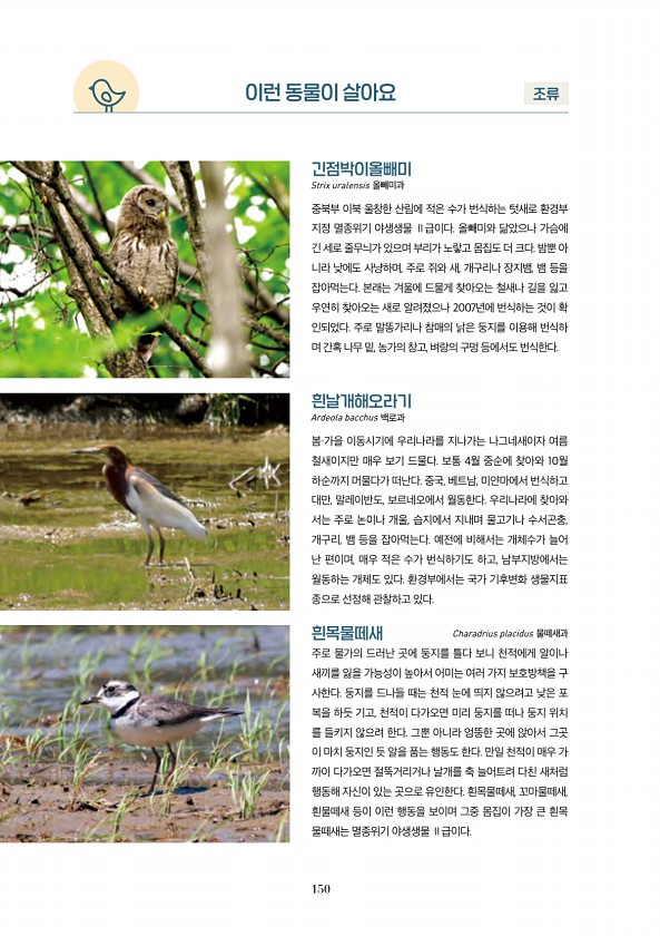 150 이런 동물이 살아요 조류 흰목물떼새 Charadrius placidus 물떼새과 주로 물가의 드러난 곳에 둥지를 틀다 보니 천적에게 알이나 새끼를 잃을 가능성이 높아서 어미는 여러 가지 보호방책을 구 사한다. 둥지를 드나들 때는 천적 눈에 띄지 않으려고 낮은 포 복을 하듯 기고, 천적이 다가오면 미리 둥지를 떠나 둥지 위치 를 들키지 않으려 한다. 그뿐 아니라 엉뚱한 곳에 앉아서 그곳 이 마치 둥지인 듯 알을 품는 행동도 한다. 만일 천적이 매우 가 까이 다가오면 절뚝거리거나 날개를 축 늘어트려 다친 새처럼 행동해 자신이 있는 곳으로 유인한다. 흰목물떼새, 꼬마물떼새, 흰물떼새 등이 이런 행동을 보이며 그중 몸집이 가장 큰 흰목 물떼새는 멸종위기 야생생물 Ⅱ급이다. 흰날개해오라기 Ardeola bac...