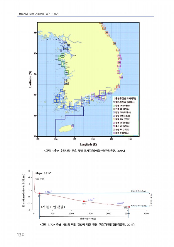 생태계에 대한 기후변화 리스크 평가 132 그림 3.70 충남 서천의 비인 갯벌에 대한 단면 구조 해양환경관리공단, 2015 그림 3.69 우리나라 주요 갯벌 조사지역 해양환경관리공단, 2015