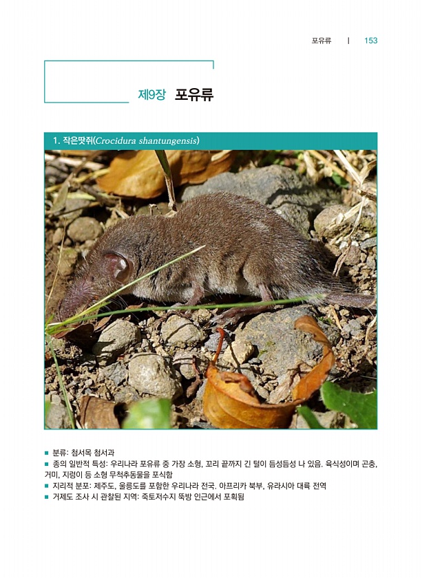 포유류 ┃ 153 제9장 포유류 ■ 분류첨서목 첨서과 ■ 종의 일반적 특성우리나라 포유류 중 가장 소형, 꼬리 끝까지 긴 털이 듬성듬성 나 있음. 육식성이며 곤충, 거미, 지렁이 등 소형 무척추동물을 포식함 ■ 지리적 분포제주도, 울릉도를 포함한 우리나라 전국. 아프리카 북부, 유라시아 대륙 전역 ■ 거제도 조사 시 관찰된 지역죽토저수지 뚝방 인근에서 포획됨 1. 작은땃쥐 Crocidura shantungensis