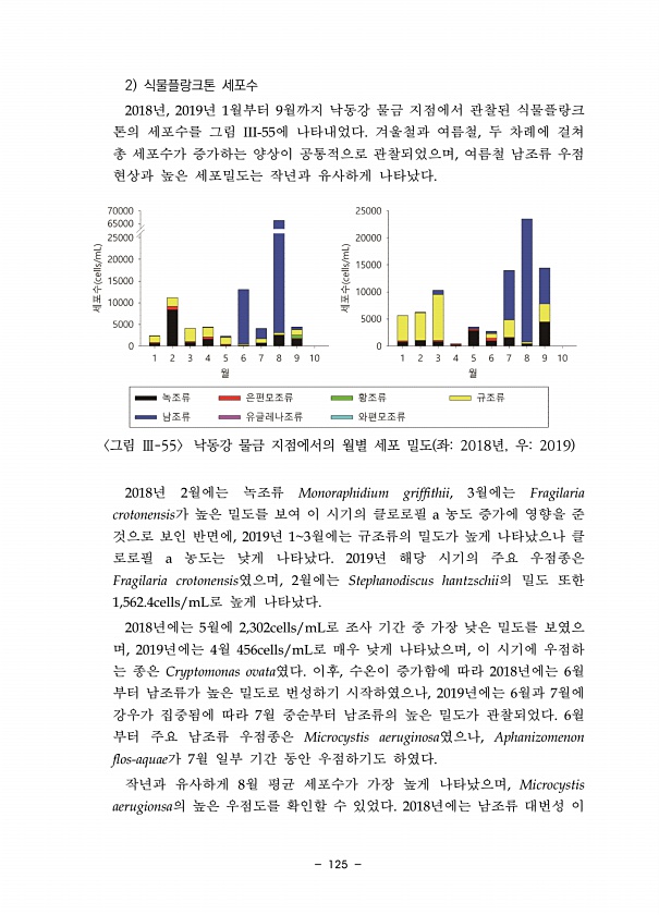 125 2 식물플랑크톤 세포수 2018년, 2019년 1월부터 9월까지 낙동강 물금 지점에서 관찰된 식물플랑크 톤의 세포수를 그림 III-55에 나타내었다. 겨울철과 여름철, 두 차례에 걸쳐 총 세포수가 증가하는 양상이 공통적으로 관찰되었으며, 여름철 남조류 우점 현상과 높은 세포밀도는 작년과 유사하게 나타났다. 그림 Ⅲ-55 낙동강 물금 지점에서의 월별 세포 밀도 좌2018년, 우2019 2018년 2월에는 녹조류 Monoraphidium griffithii, 3월에는 Fragilaria crotonensis가 높은 밀도를 보여 이 시기의 클로로필 a 농도 증가에 영향을 준 것으로 보인 반면에, 2019년 13월에는 규조류의 밀도가 높게 나타났으나 클 로로필 a 농도는 낮게 나타났다. 2019년 해당 시기...