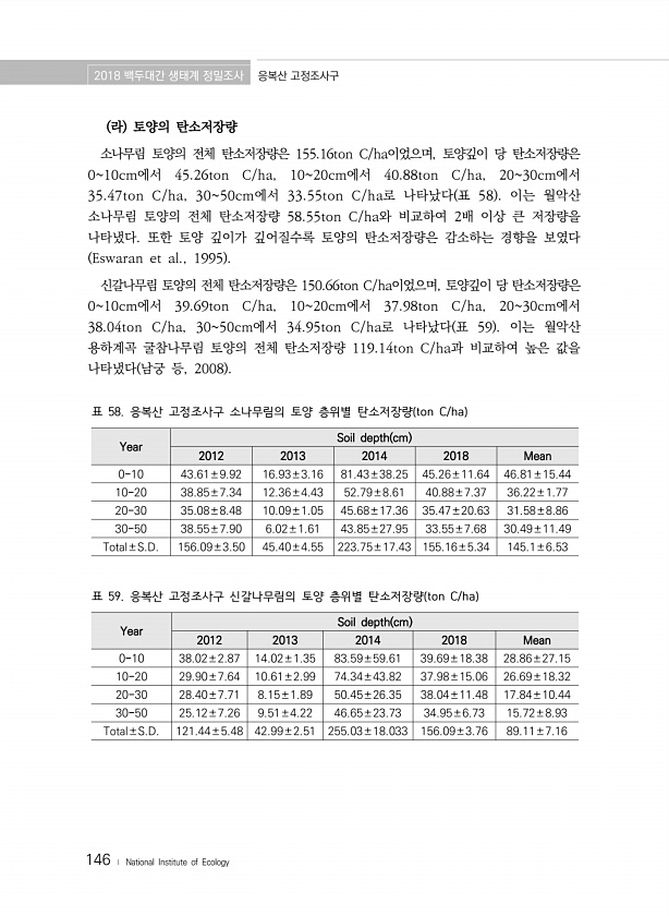 2018 백두대간 생태계 정밀조사 응복산 고정조사구 146 ? National Institute of Ecology 라 토양의 탄소저장량 소나무림 토양의 전체 탄소저장량은 155.16ton C/ha이었으며, 토양깊이 당 탄소저장량은 010cm에서 45.26ton C/ha, 1020cm에서 40.88ton C/ha, 2030cm에서 35.47ton C/ha, 3050cm에서 33.55ton C/ha로 나타났다 표 58 이는 월악산 소나무림 토양의 전체 탄소저장량 58.55ton C/ha와 비교하여 2배 이상 큰 저장량을 나타냈다. 또한 토양 깊이가 깊어질수록 토양의 탄소저장량은 감소하는 경향을 보였다 Eswaran et al., 1995 신갈나무림 토양의 전체 탄소저장량은 150.66ton C/ha이었으며, ...