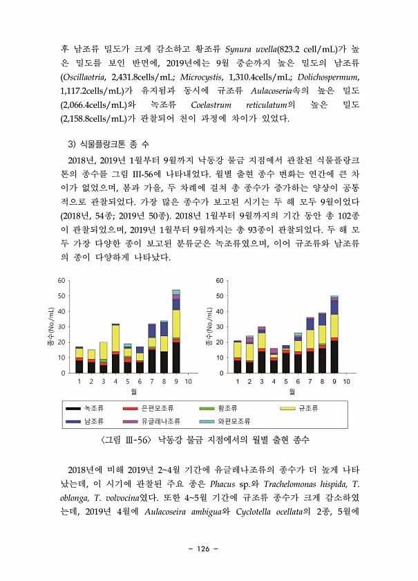 126 후 남조류 밀도가 크게 감소하고 황조류 Synura uvella 823.2 cell/mL 가 높 은 밀도를 보인 반면에, 2019년에는 9월 중순까지 높은 밀도의 남조류 Oscillaotria, 2,431.8cells/mL; Microcystis, 1,310.4cells/mL; Dolichospermum, 1,117.2cells/mL 가 유지됨과 동시에 규조류 Aulacoseria속의 높은 밀도 2,066.4cells/mL 와 녹조류 Coelastrum reticulatum의 높은 밀도 2,158.8cells/mL 가 관찰되어 천이 과정에 차이가 있었다. 3 식물플랑크톤 종 수 2018년, 2019년 1월부터 9월까지 낙동강 물금 지점에서 관찰된 식물플랑크 톤의 종수를 그림 III-56에 나타내었다....