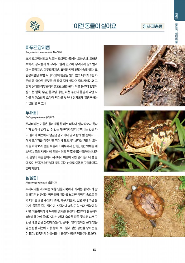 151 인제 용 용 용 용용 용 용 용 이런 동물이 살아요 양서·파충류 남생이 Mauremys reevesii 남생이과 우리나라를 대표하는 토종 민물거북이다. 자라는 등딱지가 말 랑하지만 남생이는 딱딱하며, 위험을 느끼면 등딱지 속으로 목 과 다리를 넣을 수 있다. 조개, 새우, 다슬기, 민물 게나 죽은 물 고기, 물풀을 즐겨 먹으며, 지렁이나 과일도 먹는다. 위험이 닥 치면 겨드랑이에서 독특한 냄새를 풍긴다. 4월부터 활동하며 11월에 동면에 들어간다. 67월에 축축한 땅을 뒷발로 파서 구 멍을 내고 알을 213개 낳는다. 물에서 멀리 떨어진 곳에 알을 낳는 습성 때문에 이동 중에 로드킬과 같은 봉변을 당하는 일 이 많다. 멸종위기 야생생물 Ⅱ급이자 천연기념물 제453호다. 두꺼비 Bufo gargariz...