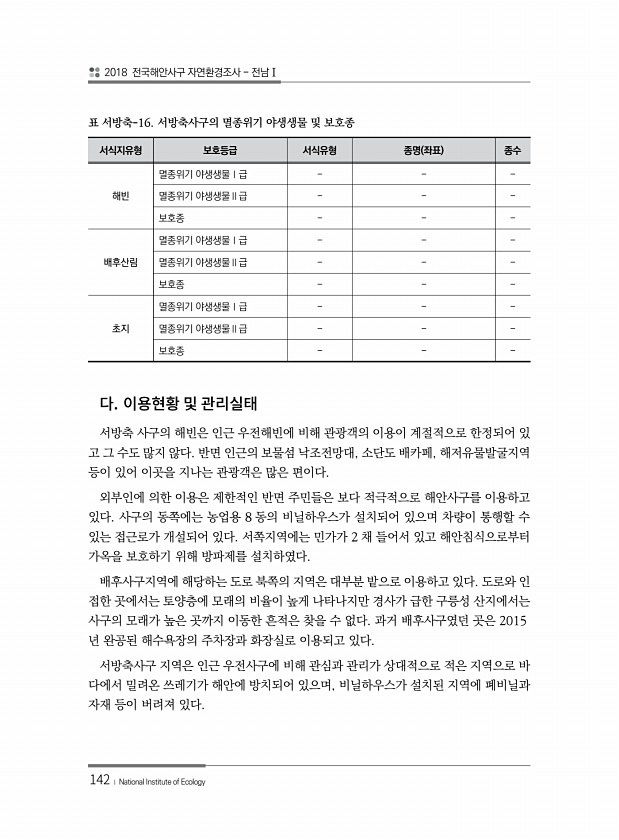 2018 전국해안사구 자연환경조사 전남Ⅰ 142 ? National Institute of Ecology 서식지유형 보호등급 서식유형 종명 좌표 종수 해빈 멸종위기 야생생물Ⅰ급 멸종위기 야생생물Ⅱ급 보호종 배후산림 멸종위기 야생생물Ⅰ급 멸종위기 야생생물Ⅱ급 보호종 초지 멸종위기 야생생물Ⅰ급 멸종위기 야생생물Ⅱ급 보호종 표 서방축-16. 서방축사구의 멸종위기 야생생물 및 보호종 서방축 사구의 해빈은 인근 우전해빈에 비해 관광객의 이용이 계절적으로 한정되어 있 고 그 수도 많지 않다. 반면 인근의 보물섬 낙조전망대, 소단도 배카페, 해저유물발굴지역 등이 있어 이곳을 지나는 관광객은 많은 편이다. 외부인에 의한 이용은 제한적인 반면 주민들은 보다 적극적으로 해안사구를 이용하고 있다. 사구의 동쪽에는 농업용 8 동...