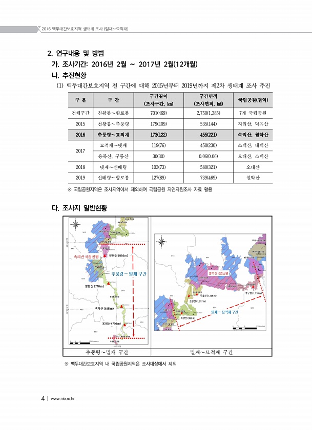 2016 백두대간보호지역 생태계 조사 밀재묘적재 4Ⅰwww.nie.re.kr 2. 연구내용 및 방법 가. 조사기간2016년 2월 ∼ 2017년 2월 12개월 나. 추진현황 1 백두대간보호지역 전 구간에 대해 2015년부터 2019년까지 제2차 생태계 조사 추진 구 분 구 간 구간길이 조사구간, ㎞ 구간면적 조사면적, ㎢ 국립공원 권역 전체구간 천왕봉∼향로봉 701 469 2,750 1,385 7개 국립공원 2015 천왕봉∼추풍령 179 109 535 144 지리산, 덕유산 2016 추풍령∼묘적재 173 122 455 221 속리산, 월악산 2017 묘적재∼댓재 119 76 450 230 소백산, 태백산 응복산, 구룡산 30 30 0.06 0.06 오대산, 소백산 2018 댓재∼신배령 103 73 580 32...
